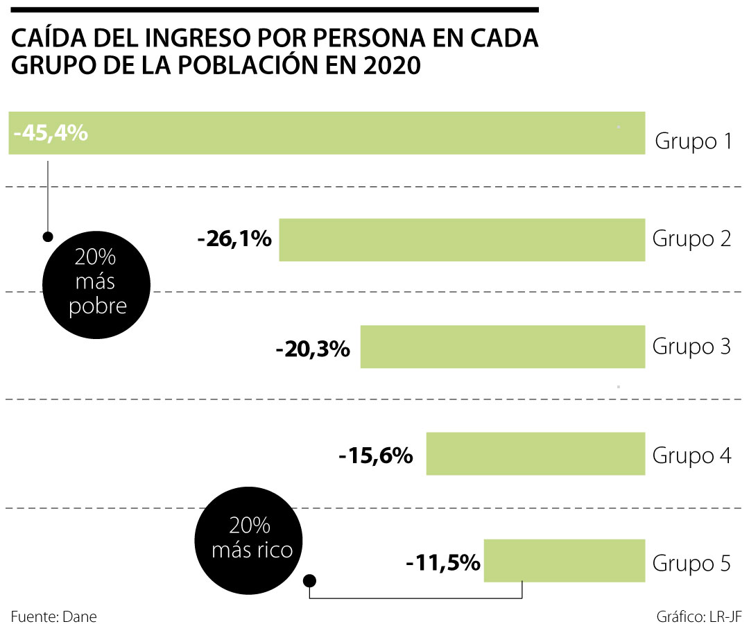 De acuerdo con las cifras del Dane, en el segundo quintil de la población la caída en los ingresos por persona fue de 26,1%