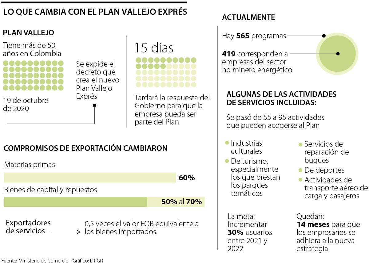 Según el ministro de Comercio, José Manuel Restrepo, antes de la modernización del instrumento, los empresarios amparados en el Plan Vallejo debían exportar 100% de los bienes que se producían con la materia prima importada sin impuestos. Pero ahora, y dependiendo de la importación hecha (programa al que se haya acogido el empresario) pueden exportar solo una parte.