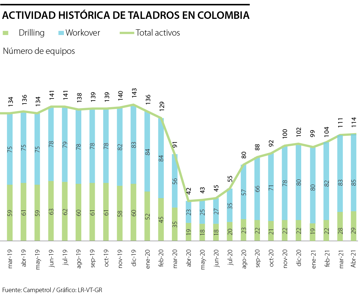 "Las condiciones de precios de los últimos meses han permitido que la actividad de taladros en Colombia continúe expandiéndose. El segmento de workover, al igual que el de Drilling, se han mantenido estables con una ligera tendencia al alza en lo corrido de 2021, alcanzando niveles máximos desde inicios de 2020, previo a la crisis del COVID-19 y el desplome de precios", se explica en el documento.