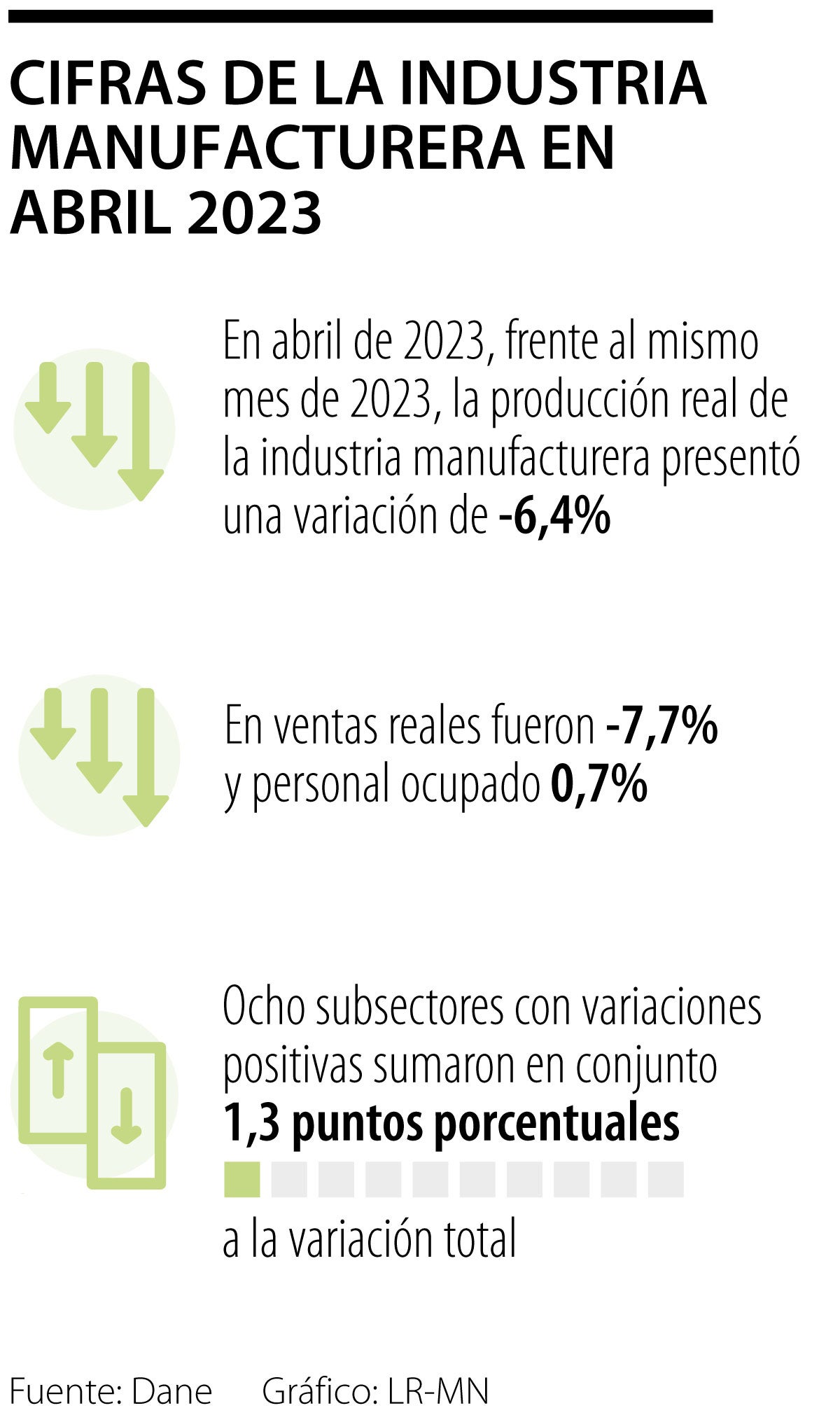 En abril, la producción de la industria manufacturera cayó 6,4% anual y las ventas reales también decrecieron en 7,7%, mientras que el personal ocupado subió 0,7%.