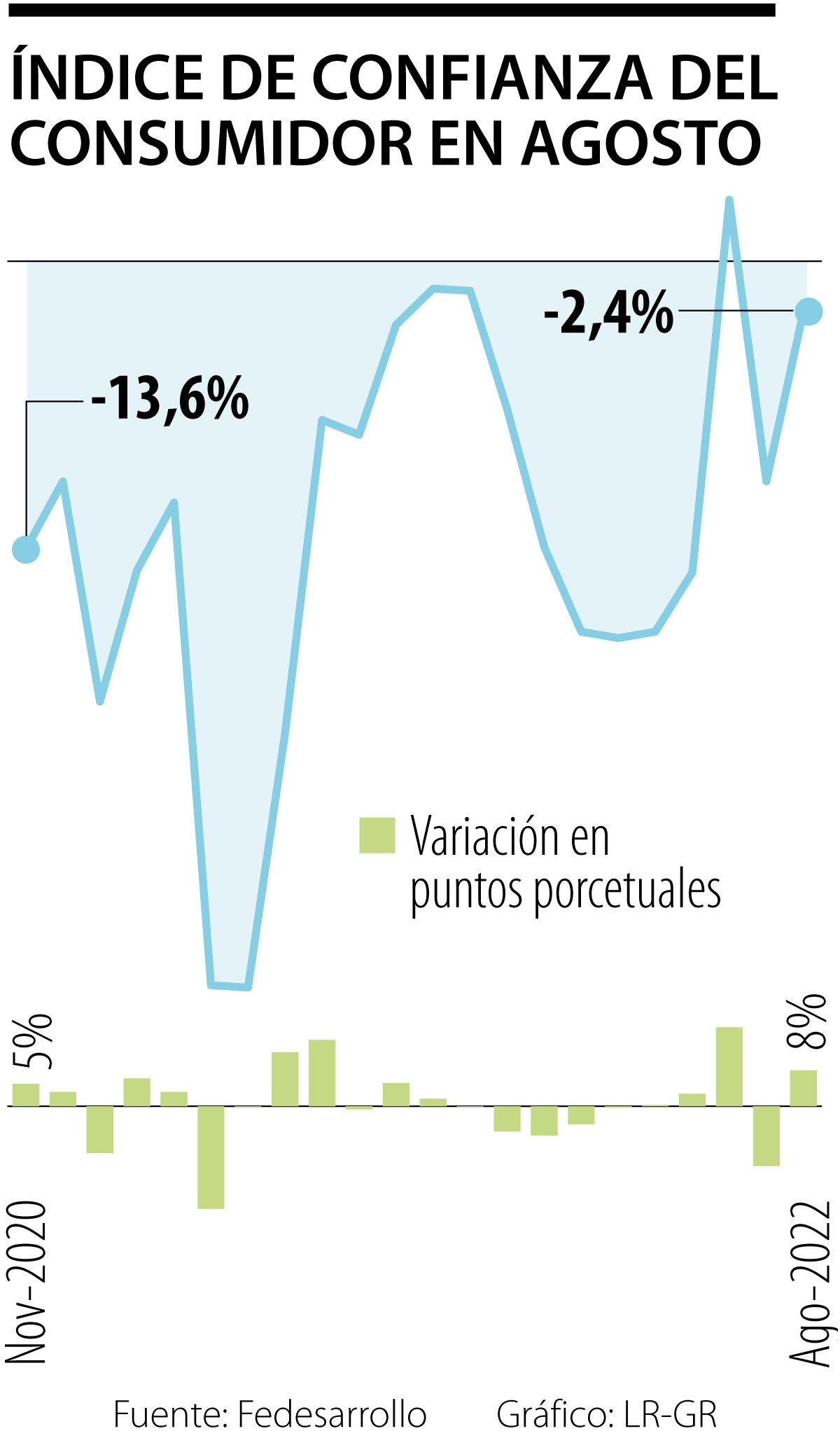 Fedesarrollo publicó los resultados de su Encuesta de Opinión del Consumidor para agosto y reportó que el Índice de Confianza del Consumidor (ICC) presentó un incremento de 8 puntos porcentuales (pps) frente al mes anterior, para ubicarse en -2,4%.