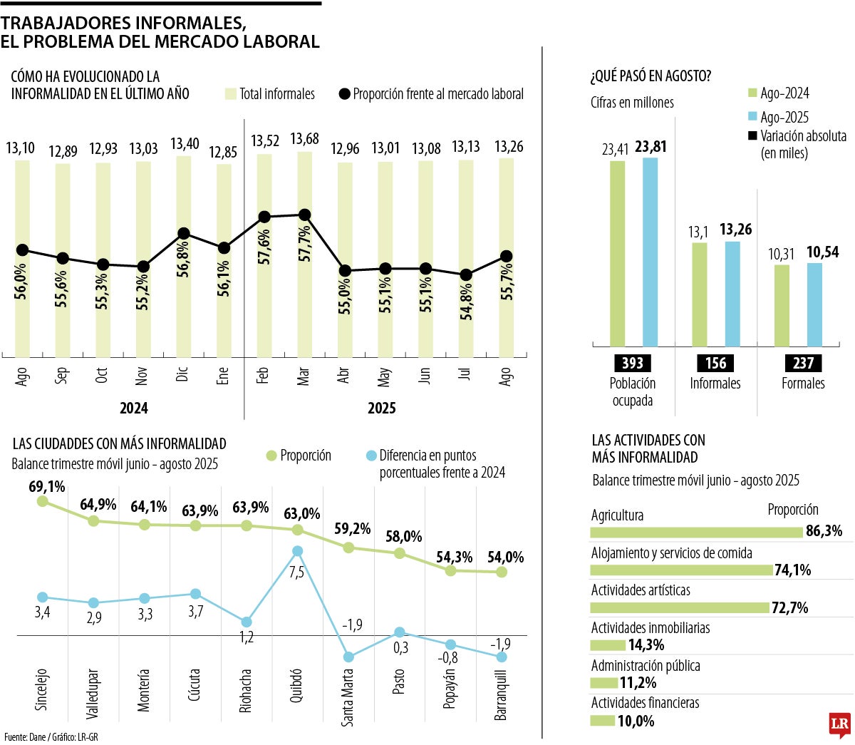 Según el reporte del Departamento Administrativo Nacional de Estadística, Dane en agosto había 23,8 millones de trabajadores, de los cuales 13,2 millones eran informales, es decir 55,7% de los empleados no aportan a la seguridad social, quiere decir que cinco de cada 10 puestos de trabajo no son formales. Si se contrasta el total de informales entre enero y agosto, la cifra ha aumentado en 275.000 personas.