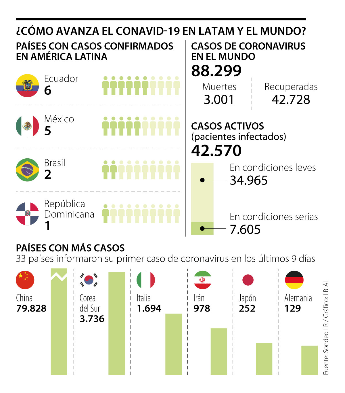 En la última semana, el virus Covid-19 llegó a América Latina y Ecuador (6), México (5), Brasil (2) y República Dominicana (1) reportaron casos de personas enfermas. A las 7:00 p.m. de ayer eran 14 las personas que dieron positivo a los exámenes de coronavirus y se calcula que más de 300 están bajo análisis por las autoridades de salud de cada país.