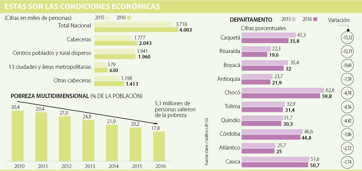 Durante 2016 se registró la tasa más baja de pobreza multidimensional de los últimos siete años, con un porcentaje de 17,8%. Esto quiere decir que 5,1 millones de personas salieron de esta situación y tienen mejores condiciones en ingresos, acceso a educación, sanidad o vivienda, entre otros factores.