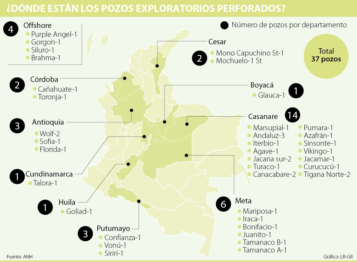 Los demás departamentos que tienen pozos exploratorios perforados son Putumayo y Antioquia con tres; Córdoba y Cesar con dos; y Cundinamarca, Boyacá y Huila con uno cada uno.