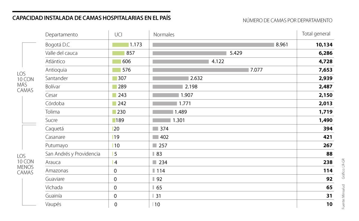 En contraste, los departamentos cuyas capitales son las más pobladas y concentran gran parte de la actividad económica, tienen mayor capacidad hospitalaria. Bogotá encabeza la lista con 1.173 UCI, de un total de 10.134 camas y el Valle del Cauca tiene 857 UCI, de un total de 6.286 camas.