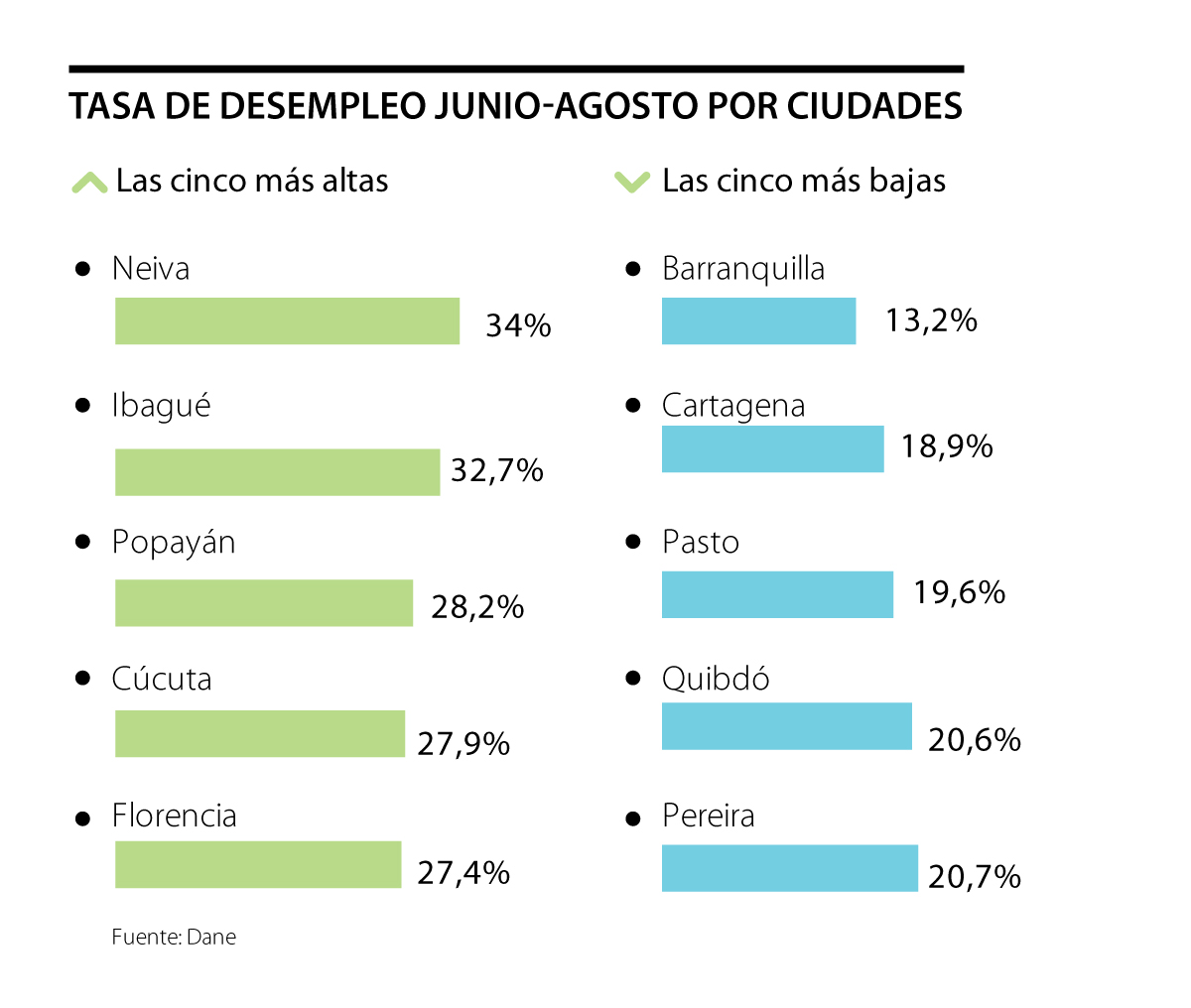 En cuanto a las ciudades con mejor desempeño en empleo, las estadísticas presentadas por el Dane mostraron que Barranquilla y Cartagena siguen siendo las urbes con la menor tasa. Entre junio y agosto, la primera obtuvo una cifra de 13,2%, mientras que en el caso de la segunda, el dato fue de 18,9%.