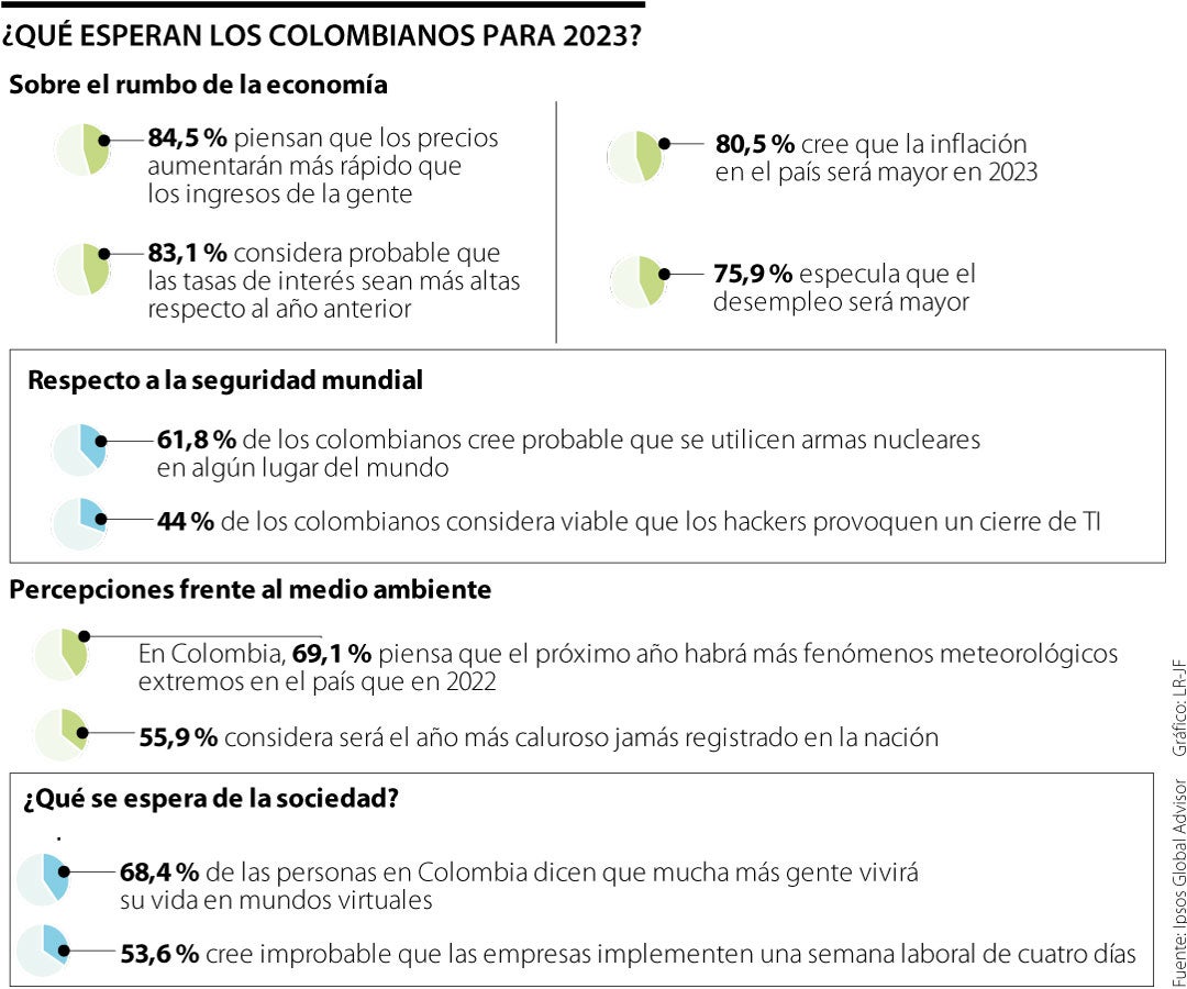 Sobre la economía, existe desesperanza, en Colombia 84,5 % piensan que los precios aumentarán más rápido que los ingresos de la gente, 83,1 % considera probable que las tasas de interés sean más altas respecto al año anterior, 80,5 % creen que la inflación en el país será mayor en 2023 y 75,9 % especula que el desempleo será mayor.