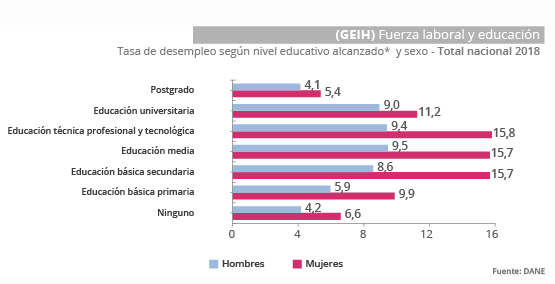 En cuanto a la diferenciación por género, la tasa de desempleo de las mujeres que completaron la educación media fue 15,7% y la de los hombres en la misma condición, 9,5%. La situación fue similar en el nivel universitario, pues el 11,2% de las mujeres graduadas de pregrado estaban desempleadas, mientras que esa situación fue reportada para 9% de los hombres.