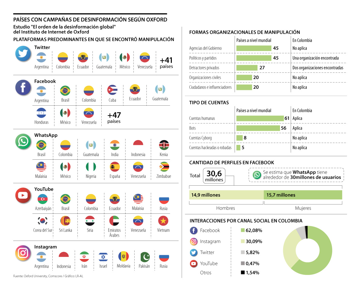 Según el documento se “recolectó evidencia de cibertropas llevando a cabo campañas en WhatsApp”, así como actividades de difusión de imágenes y video en Instagram y YouTube. En la actualidad, en 47 países se encontró este tipo de actividad en Twitter, donde destacan en la región, además de Colombia, Argentina, Ecuador, Guatemala, México y Venezuela.