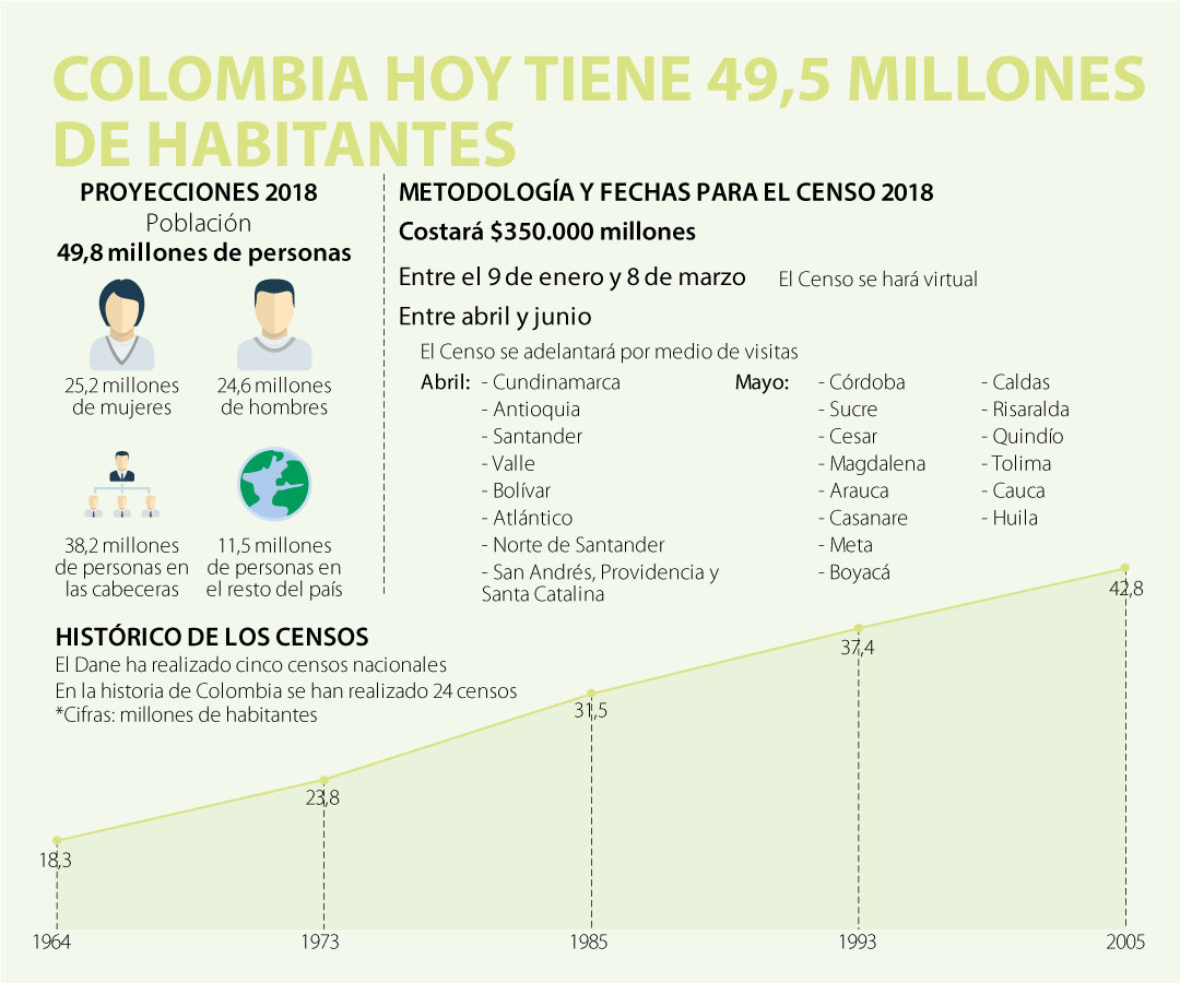 Posteriormente, se realizó el Censo Nacional Agropecuario en 1970; un Censo Nacional en 1973; el Censo Nacional de Población y de Vivienda en 1985; y otro Censo General en 1993, en este último la población local sumaba 37,4 millones de personas, casi 12 millones menos de la que hay actualmente, según las proyecciones del Dane.