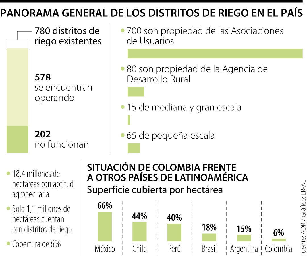 Entre las razones para que más de 200 distritos de riego no funcionen se encuentran la infraestructura en mal estado que requiere rehabilitarse, complementarse o modernizarse; concesiones de agua vencidas; asociaciones de usuarios que no funcionan; comunidades que no quieren continuar con el distrito; cambios en el uso del suelo en los planes de ordenamiento territorial y distritos de pequeña escala usados principalmente como acueductos.