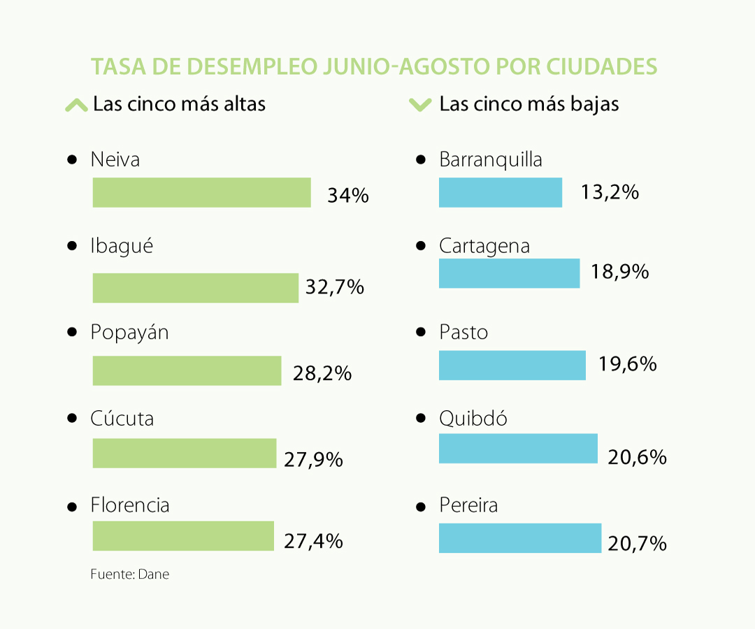 Aunque Neiva e Ibagué siguieron liderando la lista de ciudades con más desempleo, la diferencia fue que en estas dos el dato fue inferior que en el trimestre móvil mayo-julio. Neiva registró en el periodo estudiado una tasa de desempleo de 34%, lo que significó un aumento de 19,9 puntos porcentuales más que en el mismo trimestre móvil de 2019. Mientras tanto, Ibagué cerró con una tasa de 32,7%.