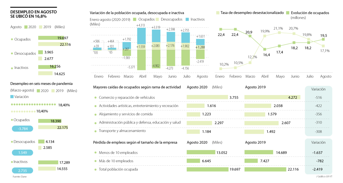 El Dane informó que, del aumento de 2,41 millones de personas desocupadas en agosto, 1,63 millones corresponden colombianos de empresas o unidades económicas menores a 10 empleados, lo que representó que 67,6% de esos puestos perdidos se registraron en pequeñas y medianas empresas (Pyme).
