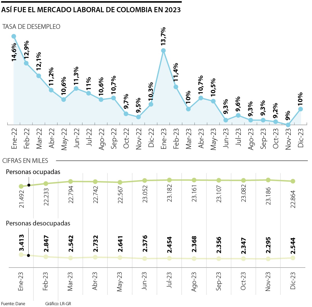 “Cuando comparamos la tasa de desempleo en diciembre del año pasado frente al 2022, hay una leve mejora, pero realmente ese diagnóstico es bien distinto cuando analizamos las cifras de tasa de desempleo desestacionalizadas”, indicó Andrés Langebaek, director de estudios económicos de Grupo Bolívar.