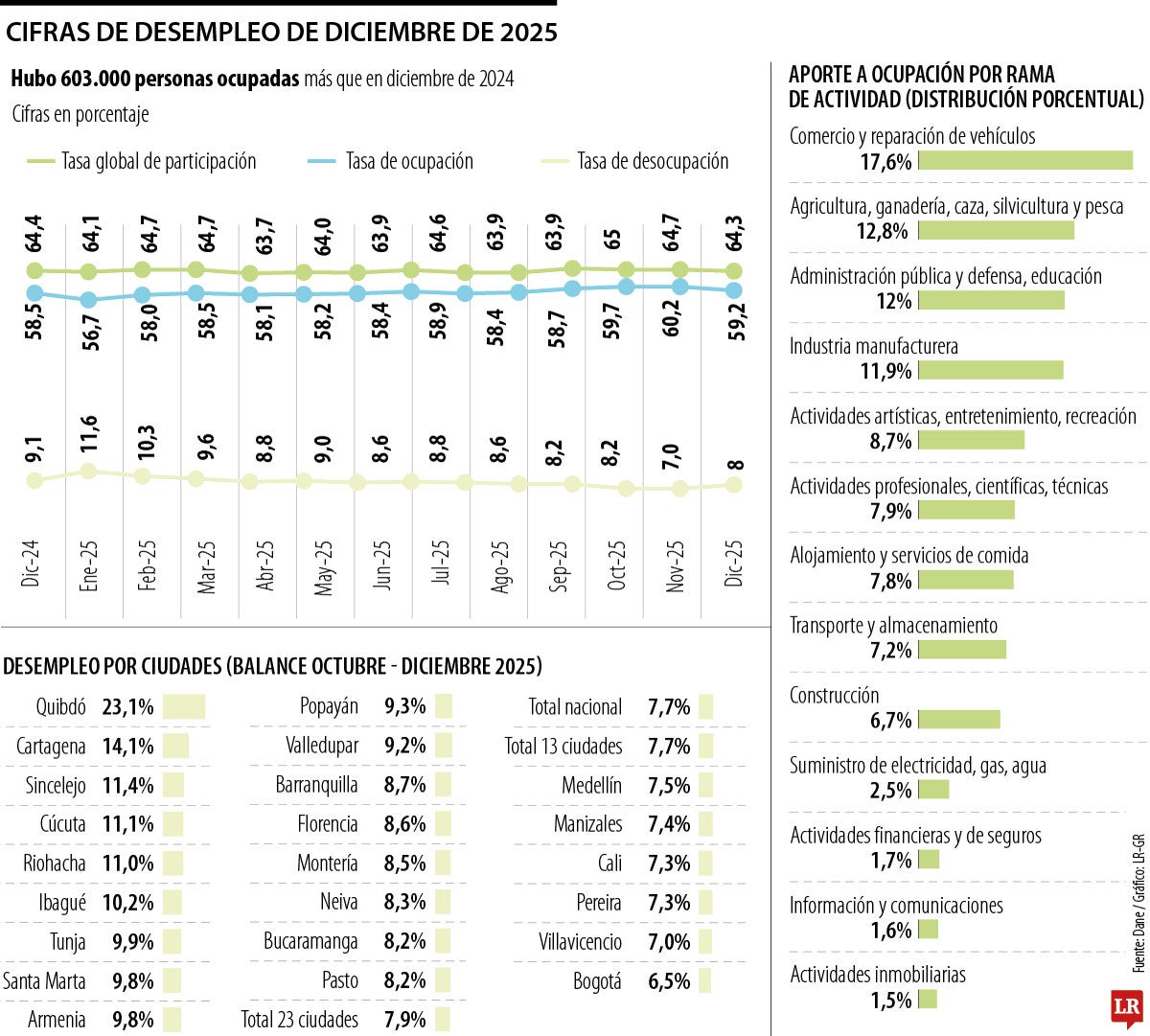 Cabe resaltar que el último año registró avances en el mercado laboral del país. Entre enero y diciembre de 2025, la tasa global de participación fue de 64,3% y la tasa de ocupación alcanzó 58,6%. Piedad Urdinola, directora del Dane, aseguró que en diciembre de 2025 la población ocupada aumentó en 603.000 personas, lo que representa un incremento de 2,6% frente al mismo mes del año anterior.