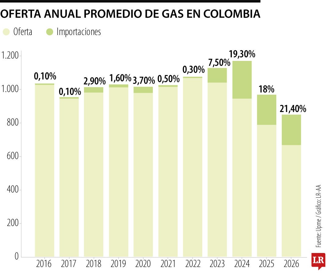 En el sector energético una de las alarmas en el último año ha sido el incremento de las importaciones de gas, esto en razón a la reducción de reservas. De hecho, Naturgas alertó que para 2026 esperan que las importaciones representen 26% del gas que se consume en el país. En consonancia con esa tendencia, tomando datos de la Upme, en enero de este año el gas importado representó 21% del total consumido.