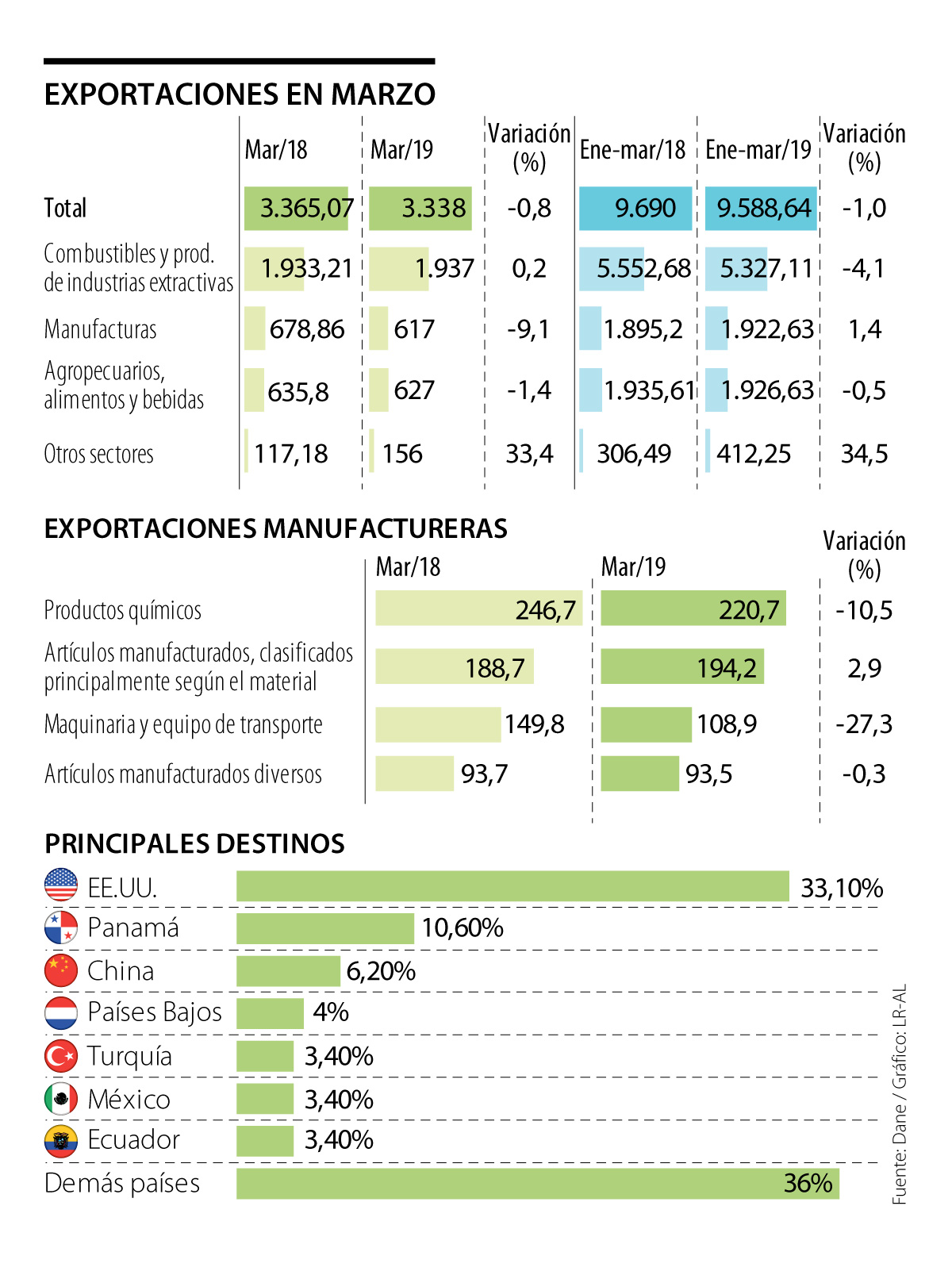 El Dane reportó una disminución de 0,8% en las ventas al extranjero de marzo, lo que dejó un saldo de US$3.337,5 millones al exterior. combustibles disminuyeron 4,1%