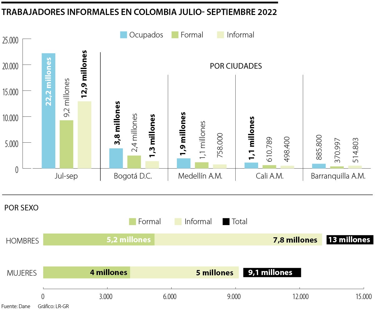 La informalidad sigue ocupando una porción importante en el mercado laboral de Colombia. El Dane reveló que en el tercer trimestre del año (julio-septiembre) la cifra llegó a 12,9 millones de trabajadores, 4,8% más si se compara con los 12,3 millones que había en el mismo periodo del año pasado.