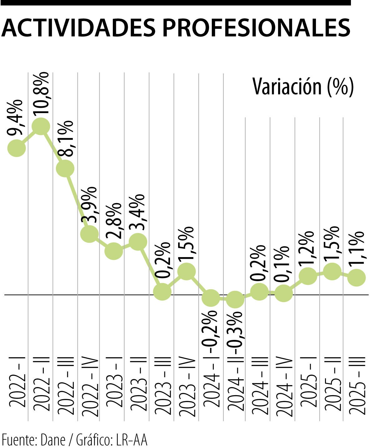 El sector de actividades profesionales, científicas y técnicas y de actividades de servicios administrativos y de apoyo completaron cinco trimestres al alza, pero con crecimiento mínimo, de apena arriba de 1%. En el tercer trimestre del año el impulso fue de 1,1%, menor al segundo trimestre, cuando creció 1,5%, pero muy superior al mismo trimestre del año pasado, cuando tuvo un incremento de apenas 0,2%. Su aporte fue de 0,1 puntos porcentuales, entre los más bajos del Producto Interno Bruto.