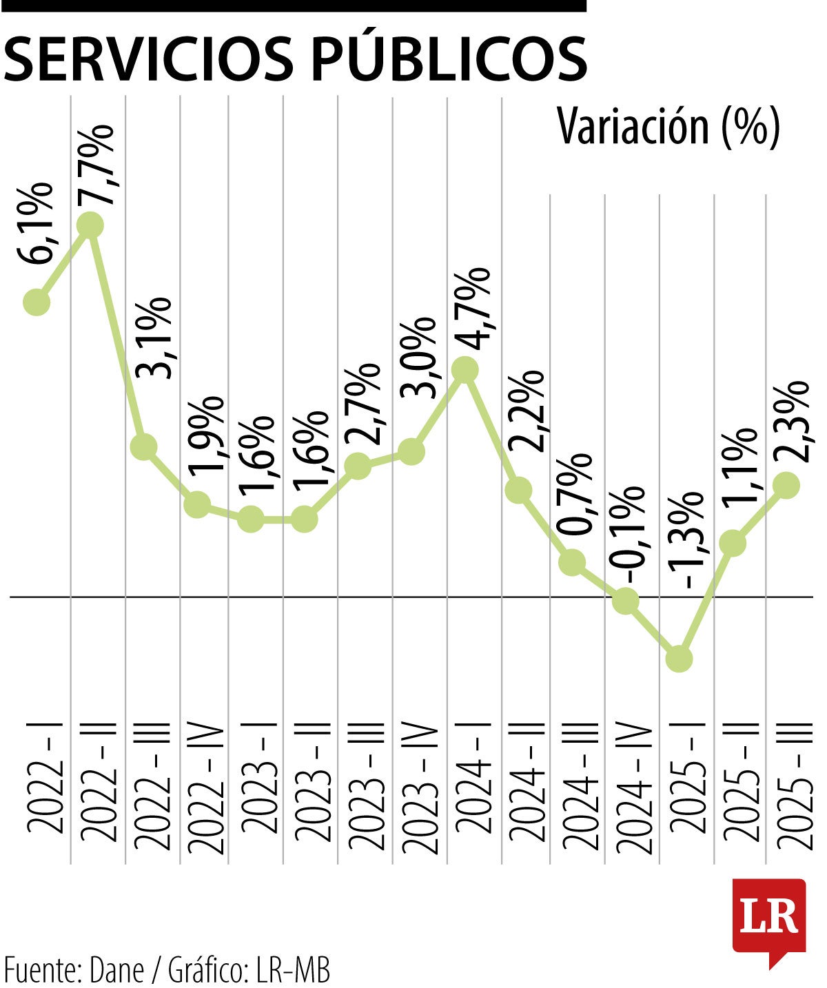 Todo lo relacionado con los servicios públicos, entre lo que se incluyen el suministro de electricidad, gas, vapor y aire acondicionado y la distribución de agua, tuvo un incremento económico de 2,3%. El servicio de mayor crecimiento fue el de la luz y electricidad, que tuvo un aumento de 3,1% y aportó 2,1 puntos porcentuales a la rama, casi la totalidad del crecimiento de este sector. El tratamiento de aguas residuales aportó 0,4 puntos y el suministros de agua, 0,2 pp.