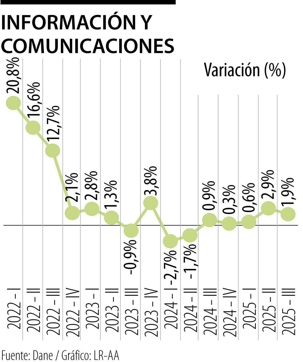 El macrosector de información y comunicaciones avanzó tanto anual como trimestral por un aumento de la demanda por servicios de internet fijo y de telefonía móvil. El segmento continuó recuperándose y en el tercer trimestre del año tuvo un crecimiento de 1,9%, un punto por encima que hace un año (0,9%). Sin embargo, el crecimiento fue menor al aumento de 2,9% que se registró en el periodo entre abril y junio de este año, la cifra más alta para este sector en lo que va del año.