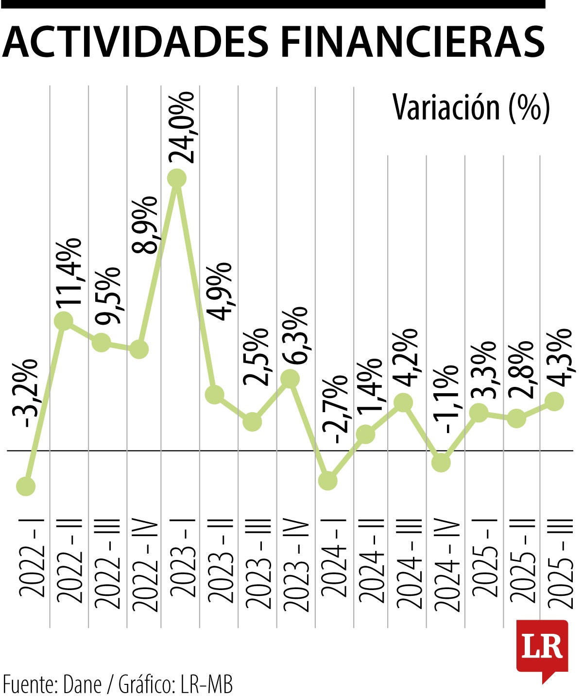 Durante el periodo que comprende julio a septiembre, sobresalió también el desempeño de los sectores financiero y de seguros los cuales registraron un crecimiento en la serie trimestral de 4,3% y aportaron 0,2 puntos al PIB general. Fue el mejor trimestre para este sector luego de crecer 3,3% entre enero y marzo, y 2,8% entre abril y junio. El resultado también fue ligeramente mejor que en el mismo periodo del año pasado, cuando las actividades financieras crecieron 4,2%.