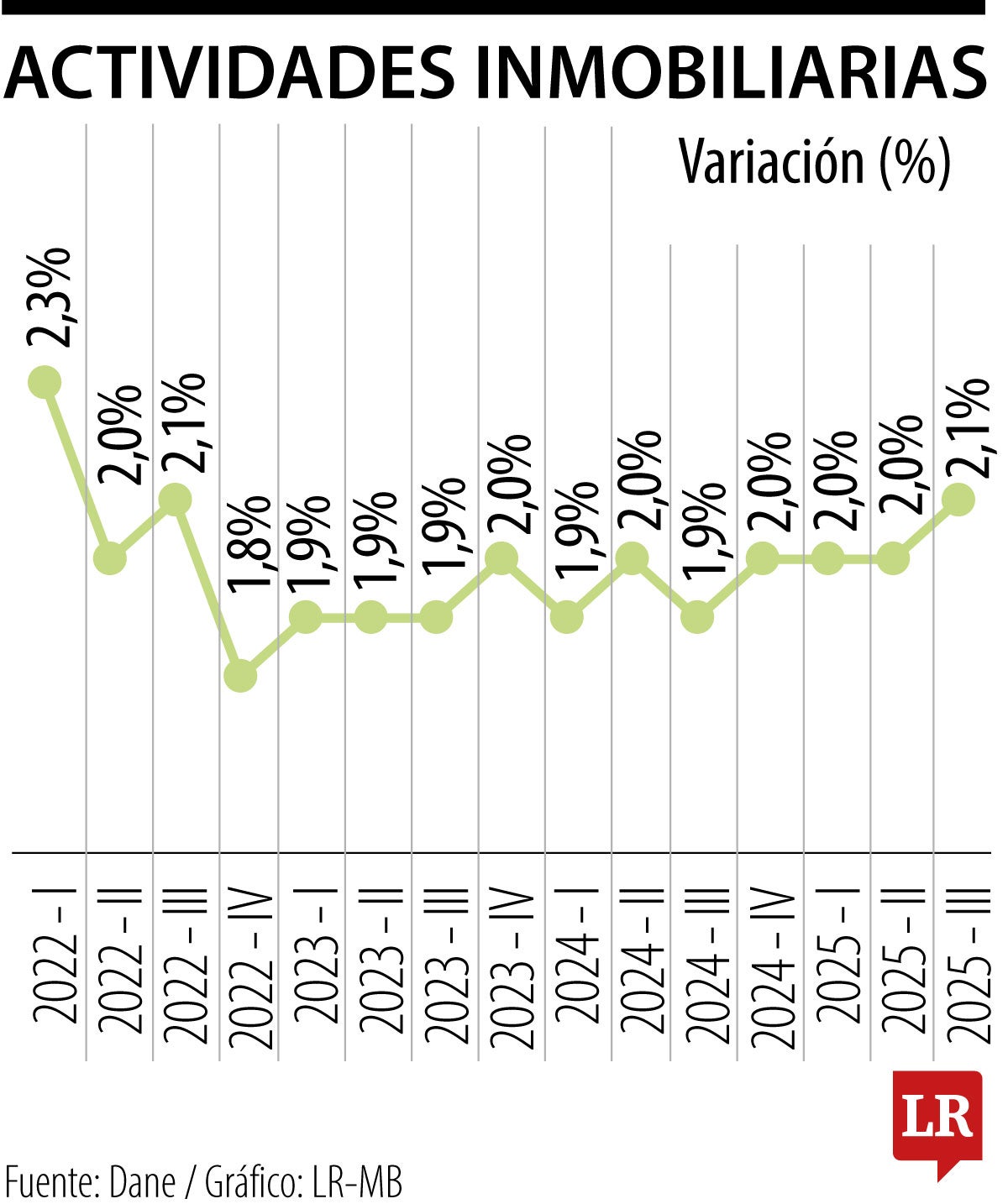 El sector de actividades inmobiliarias tuvo un crecimiento de 2,1% en el tercer trimestre de 2025 y completó 20 trimestres con aumentos superiores a 1,5%. Sin embargo, esta actividad parece haberse estancado en un incremento anual en torno a 2% en los últimos tres años. La última vez que creció más de 2,1% fue en el primer trimestre de 2022 (2,3%). Desde entonces, esta actividad económico ha registrado tasas de crecimiento de entre 1,8% y 2,1% en cada publicación trimestral del Dane.