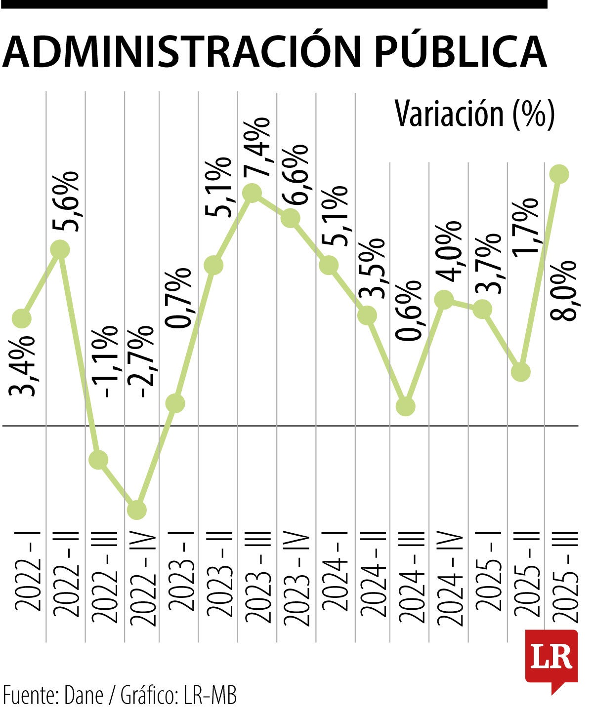 La expansión económica trimestral estuvo liderada por la administración pública y defensa, que creció 8% y un aporte a la cifra absoluta de 1,3 puntos porcentuales.