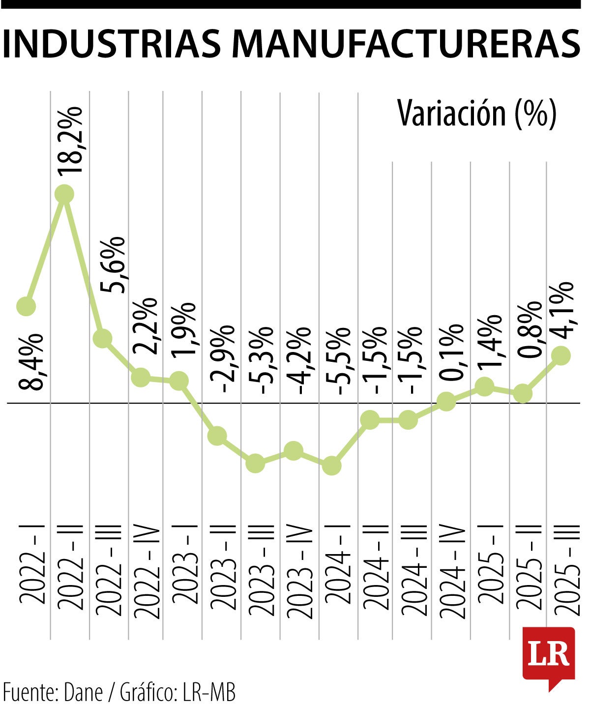 El tercer aporte del PIB fue el de industrias manufactureras, cuyo crecimiento fue de 4,1% y 0,5 puntos porcentuales al dato general. Los subsectores de mayor expansión en el tercer trimestre del año fueron los de trilla de café (42%), alimentos para animales (13%), prendas de vestir (11%) y lácteos (10%). Al final, según Investigaciones Económicas del Banco de Bogotá, la agroindustria ha explicado 50% del crecimiento económico de la manufactura en el transcurso de 2025.