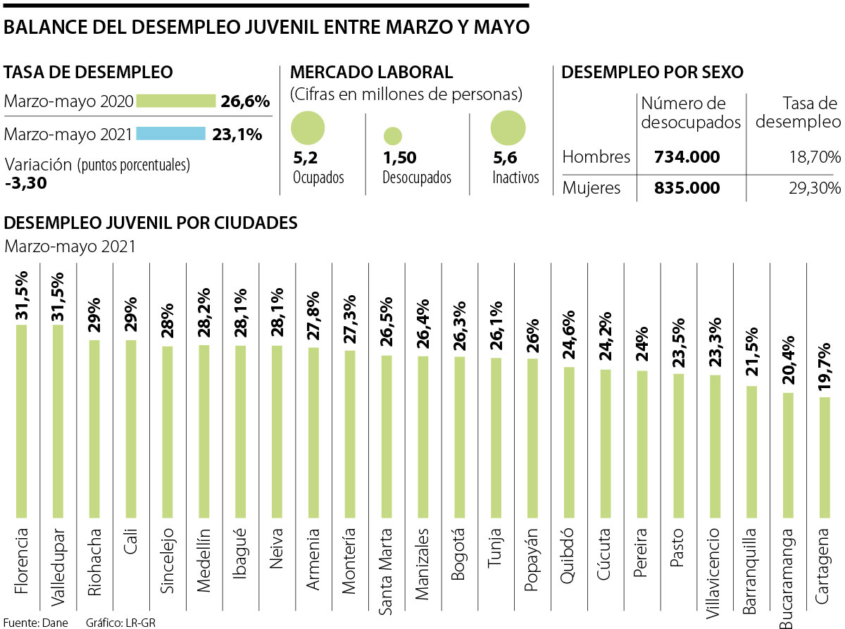 Según el Dane, la desocupación juvenil llegó a 23,1% en ese periodo. Las ciudades con las mayores tasas fueron Florencia y Valledupar