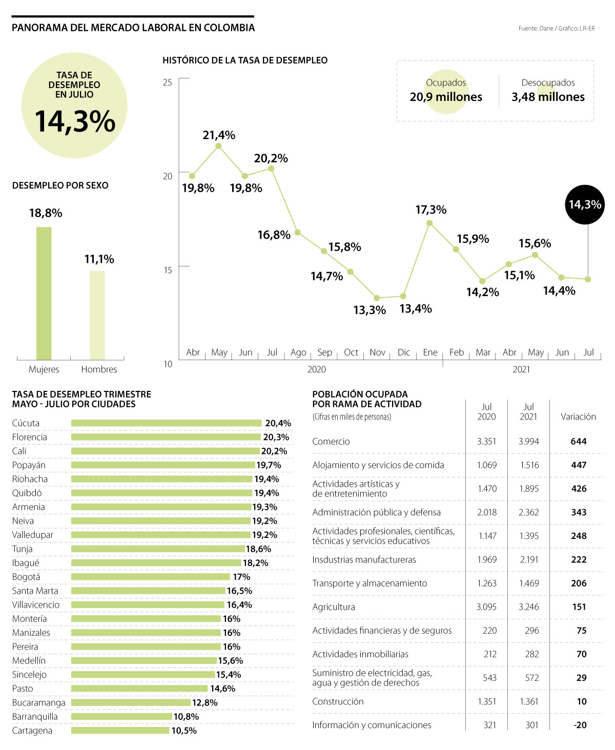 En julio de 2021 1,07 millones de personas salieron del desempleo, con lo que la tasa para ese mes se ubicó en 14,3%