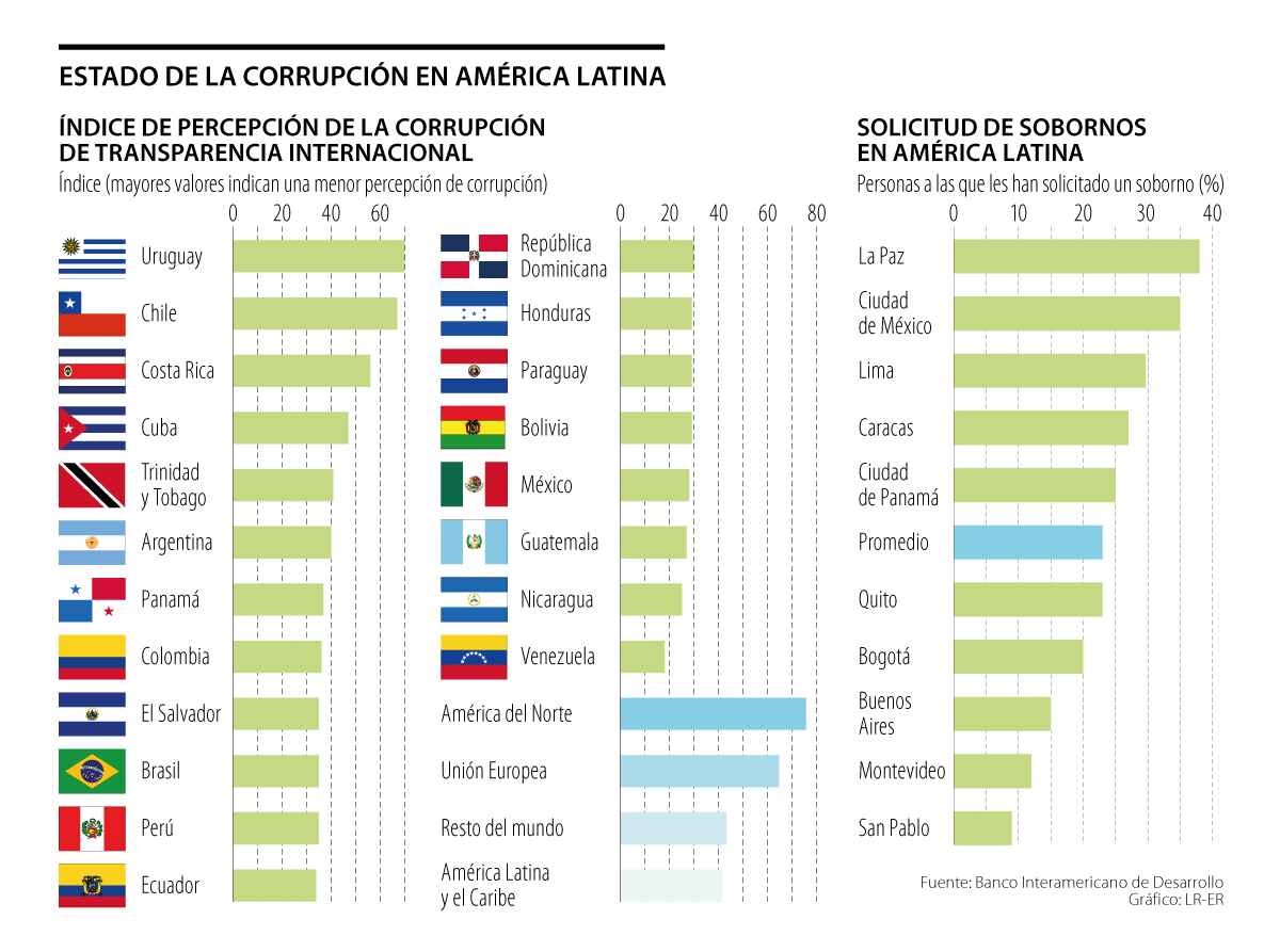El Banco Interamericano de Desarrollo (CAF) entregó su reporte ‘Integridad en las políticas públicas’ en el que detalla cómo están los niveles de corrupción en América Latina y, especialmente, en las principales capitales de la región. El documento hace un llamado de atención en el hecho de que 23% de la población, en el último año, dijo que algún funcionario público le ha pedido un soborno o pago informal para obtener un servicio o agilizar un trámite.