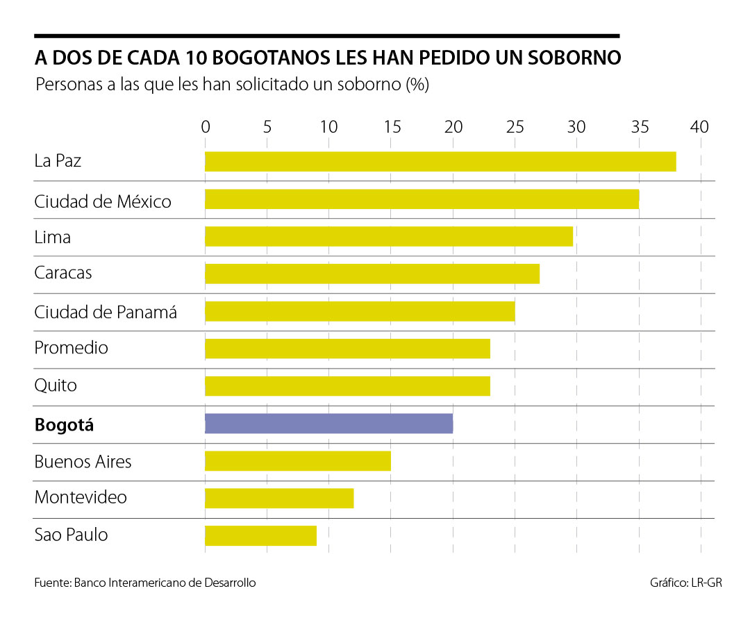 Aunque 23% es el promedio de la región, los picos más altos están en La Paz (Bolivia) con casi 40% y Ciudad de México con 35%. En el caso de Bogotá, pese a que no es de las ciudades más corruptas en ese sentido, sí aparece con 20%.
