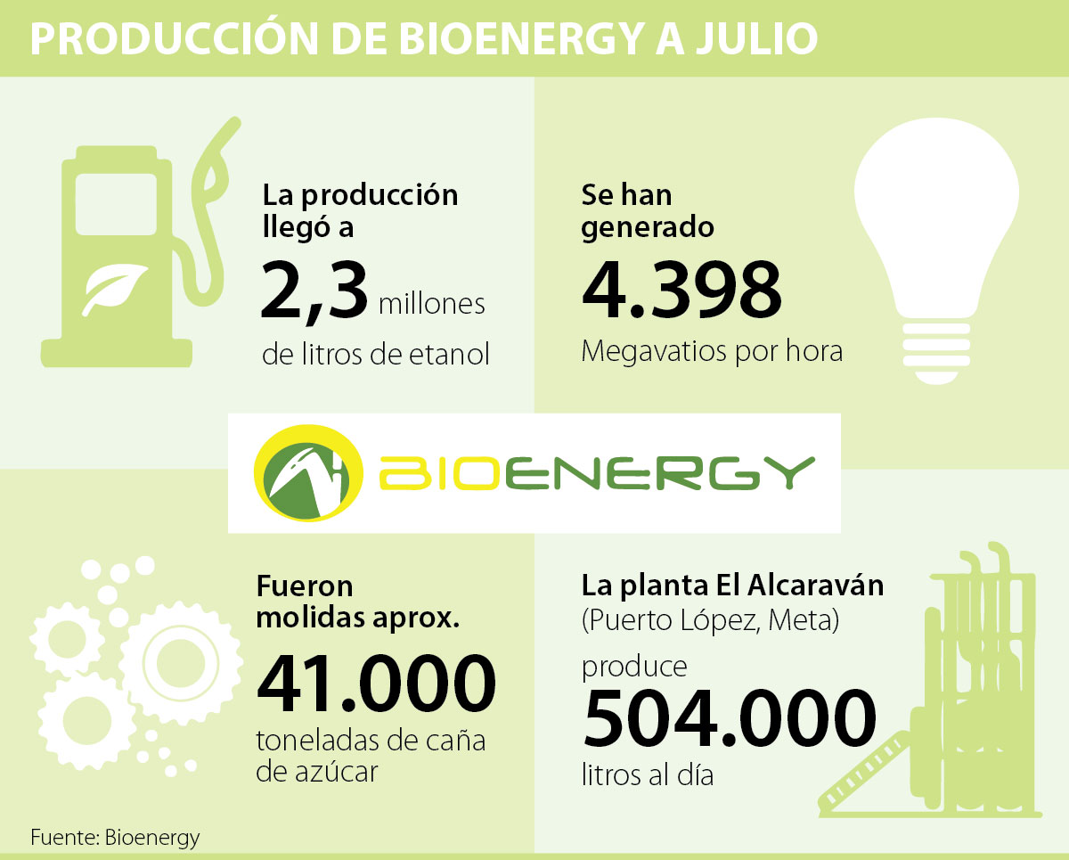 Desde el pasado 18 de marzo, fecha en que inició la producción continua en la planta El Alcaraván, ubicada en Puerto López (Meta), hasta el cierre de julio, Bioenergy ha producido 2,3 millones de litros de etanol, para lo cual molió cerca de 41.000 toneladas de caña de azúcar.