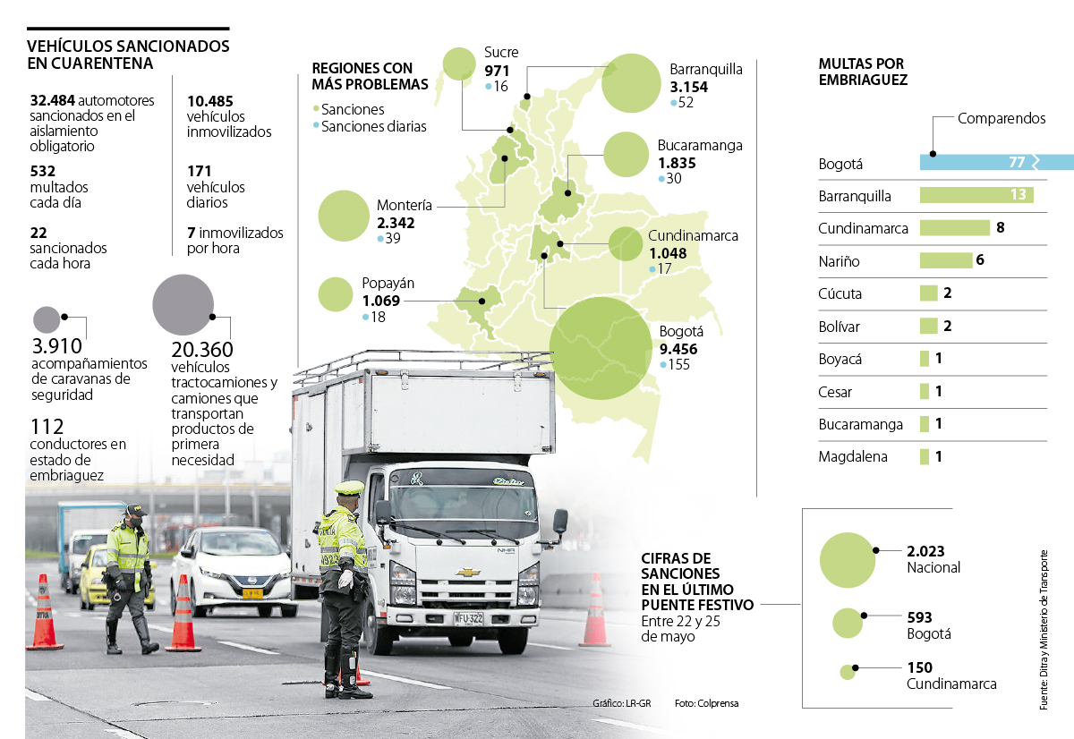 En el último puente festivo, entre el 22 de mayo y el 25, la cifra de sancionados aumentó 2.766 al pasar de 29.835 con corte al 21 de mayo, al total de 32.484 al lunes festivo.