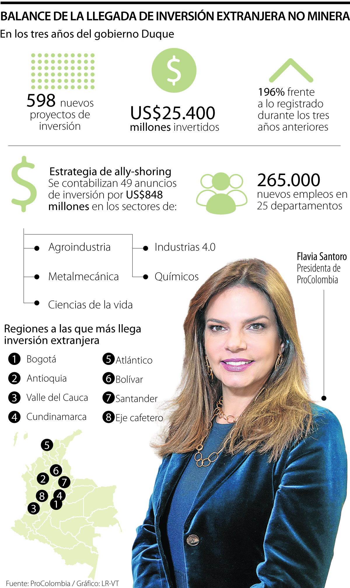 “Entre agosto de 2018 y hasta agosto de 2021, ProColombia ha apoyado la llegada de 598 proyectos de inversión por US$25.400 millones, cifra que representa un incremento del 196% frente a lo registrado durante los tres años anteriores, y en el que de acuerdo con los inversionistas se estima la creación de más de 265.000 nuevos empleos en 111 municipios de 25 departamentos del país”, aseguró la presidenta Flavia Santoro.