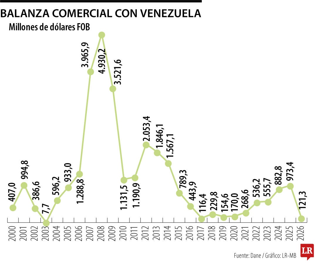 Esta ha sido una tendencia que se ha mantenido a lo largo del siglo, ya que desde 1998 Colombia no registra una balanza comercial deficitaria con Venezuela. Además, desde 2019 el superávit ha venido en aumento: en ese año se ubicó en US$154,6 millones; en 2020 fue de US$170 millones; en 2021 alcanzó US$268,6 millones; en 2022 llegó a US$536,2 millones; en 2023 fue de US$555,7 millones; en 2024 se ubicó en US$882,8 millones; y en 2025 cerró en US$973,4 millones, lo que refleja un crecimiento cercano a 86%.
