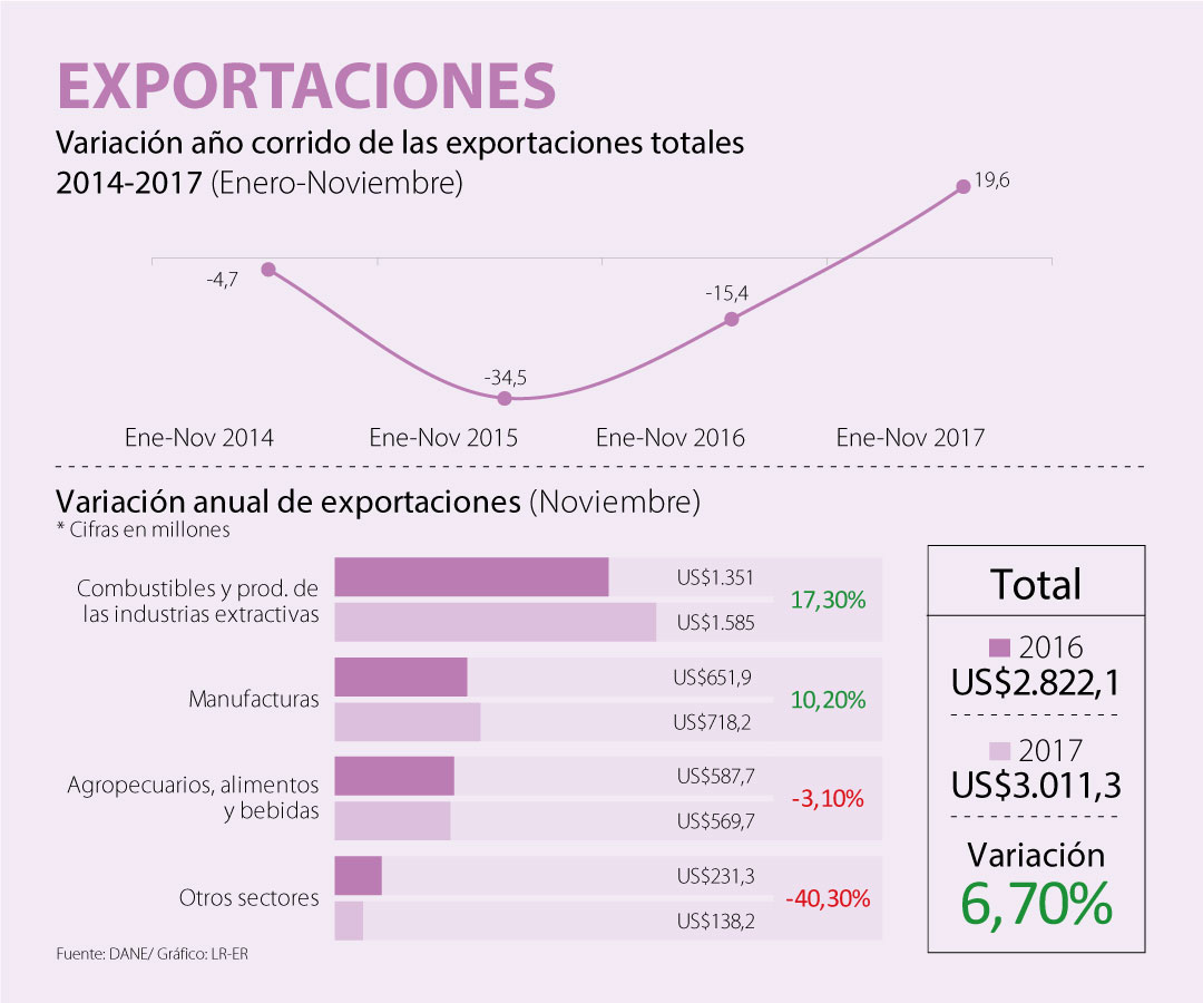 El Departamento Administrativo Nacional de Estadística (Dane) informó este miércoles que en noviembre de 2017 las exportaciones totales fueron de US$3.011,3 millones FOB (Free on Board) con una variación anual de 6,7%.