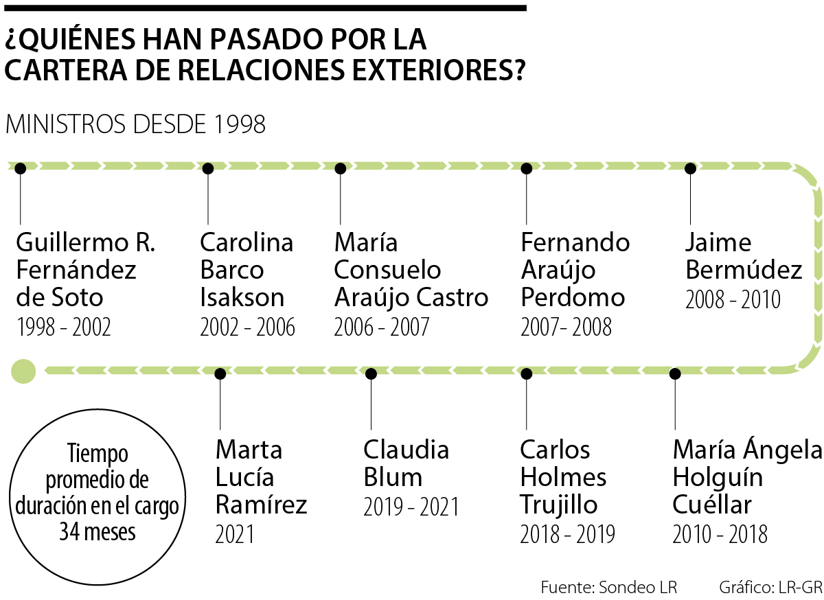 Con el anuncio del presidente Iván Duque de nombrar a la actual vicepresidente como ministra de Relaciones Exteriores, Marta Lucía Ramírez sería la canciller número nueve que tiene el país desde 1998, cuando el líder de la cartera era Guillermo Fernández de Soto. El tiempo promedio de duración en la dirección de la cartera internacional desde ese periodo es de 34,5 meses.