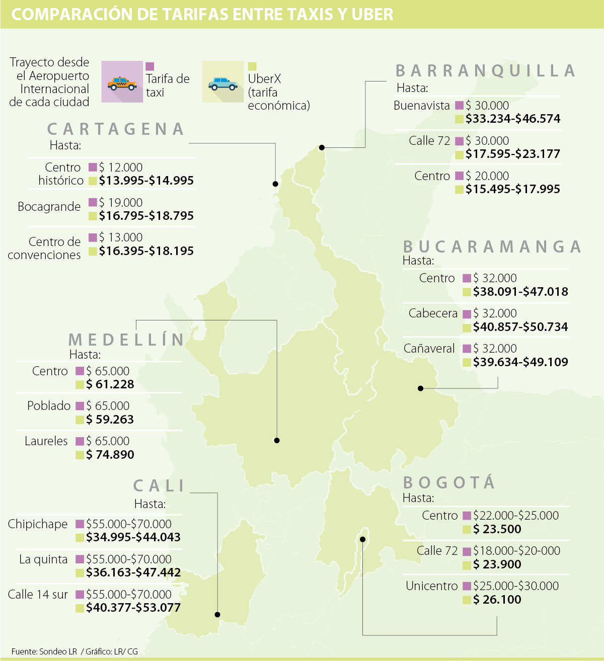 A propósito de las diferencias entre Uber y los taxistas tradicionales o amarillos, LR comparó las tarifas de ambos servicios en Bogotá, Medellín, Cali, Cartagena, Barranquilla y Bucaramanga. Para ello, utilizó como punto de partida el aeropuerto internacional de estas ciudades y como destino tres de las localidades o lugares más comunes o visitados.