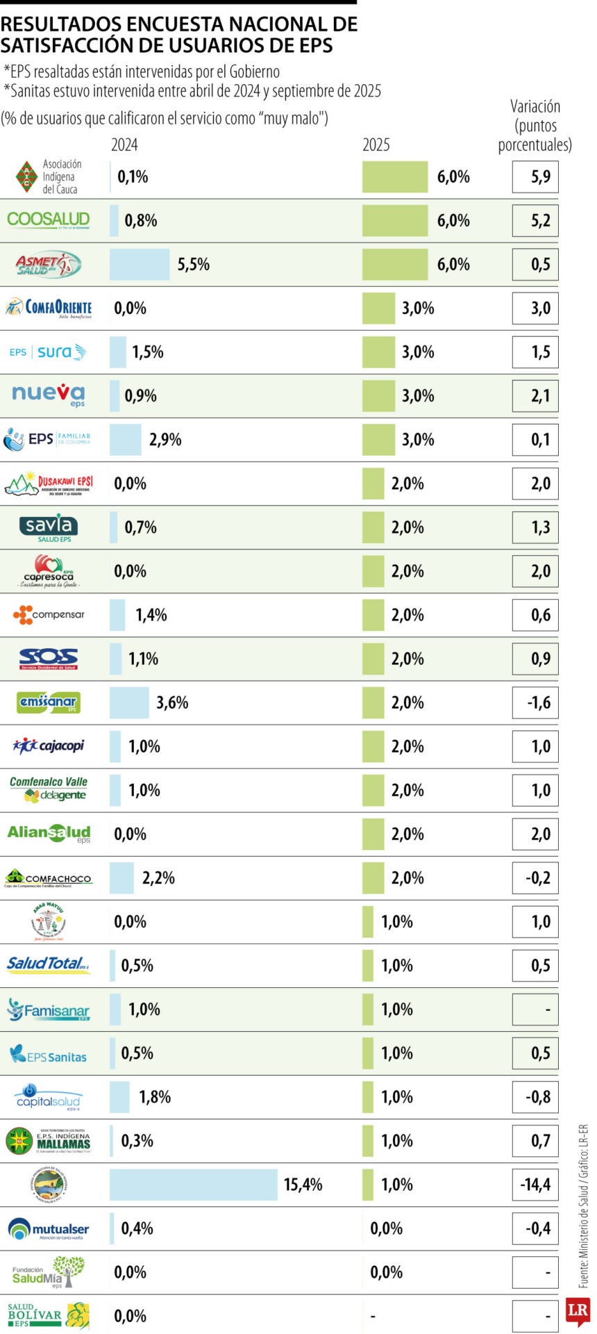 Las otras dos EPS intervenidas que también bajaron sus niveles de satisfacción fueron Capresoca, en la cual el indicador positivo pasó de 64,1% en 2024 a 54% en 2025; y Asmet Salud, que mostró una disminución de 52,4% a 50% en el último año.