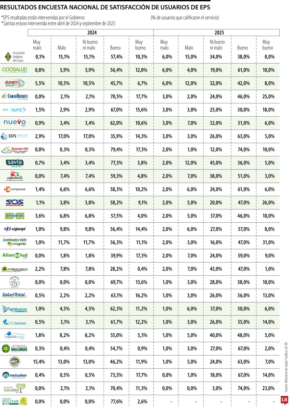 Al tomar como referencia la cantidad de usuarios que calificaron el servicio como 'bueno' y 'muy bueno', la EPS intervenida que tuvo un descenso más marcado fue Savia Salud (42,1 pp), pues la favorabilidad pasó de 83,1% en 2024 a 41% en 2025. A esta le siguieron Famisanar y Nueva EPS, con reducciones de 17,5 pp y 15,6 pp, respectivamente.