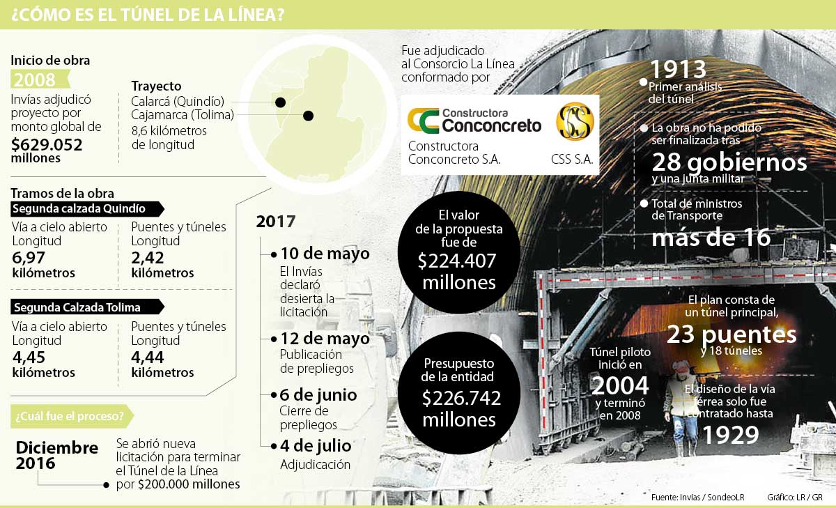 El Invías adjudicó la terminación de obras por $224.407 millones al Consorcio La Línea, el cual está conformado por Conconcreto S.A. y CSS S.A. La obra estaría lista en julio de 2018.