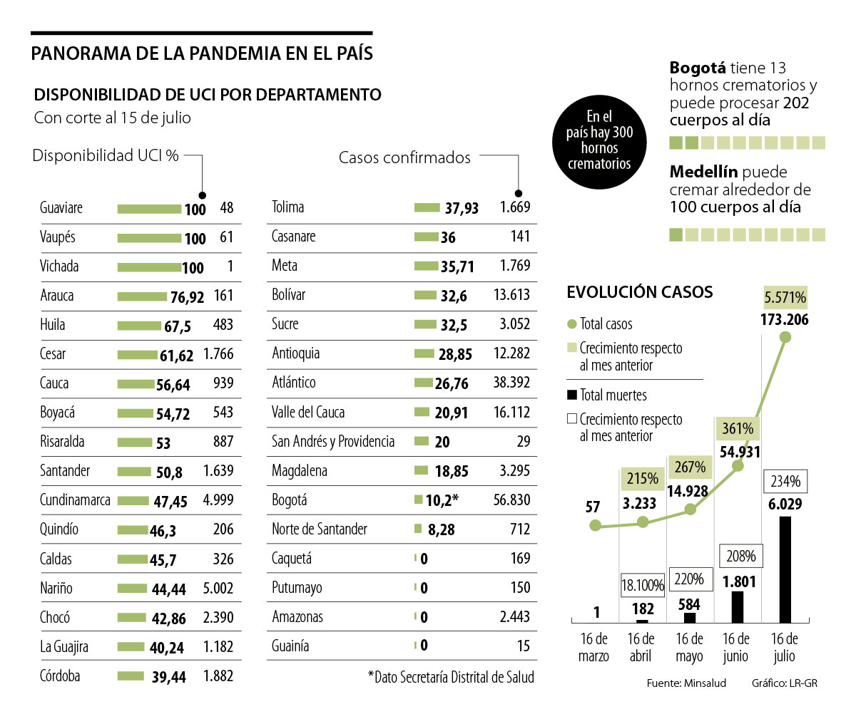 En ese orden de ideas, al comparar la cifra de decesos por covid-19 del 16 de junio, cuando el país acumulaba 1.801 muertos, y del 16 de julio, se evidencia un incremento de 4.228 personas fallecidas por esta causa. Lo anterior, a su vez, revela un crecimiento de 234% en la demanda de hornos crematorios y de servicios funerarios según las empresas del sector.