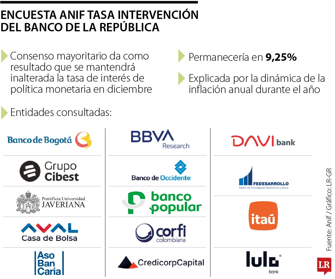 Anif señaló que, de 15 analistas consultados, 11 consideraron que no habrá recortes en la tasa de interés en diciembre y calificaron esa decisión como acertada. Por su parte, la Pontificia Universidad Javeriana indicó que lo más recomendable sería un aumento de 25 puntos básicos.
