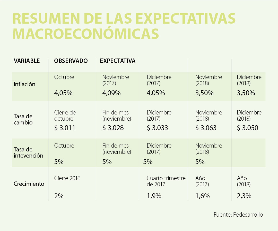 Para 2018, las proyecciones son mucho más positivas, pues se espera que el IPC vuelva a ubicarse dentro de la meta y concluya el próximo año en 3,5%.