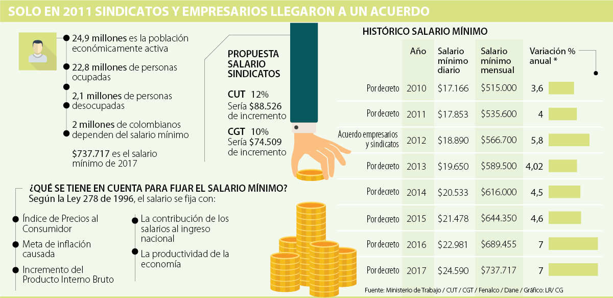 El Ministerio de Trabajo convocó para hoy a la Comisión de Concertación de Políticas Salariales y Laborales con el fin de que se inicie el estudio al reajuste del salario mínimo para el próximo año. Aunque hasta el momento solo hay dos propuestas de los sindicatos, un nuevo debate se abre en la discusión y es tener un salario diferencial por regiones, de acuerdo con un sondeo que realizó LR con cinco gremios.