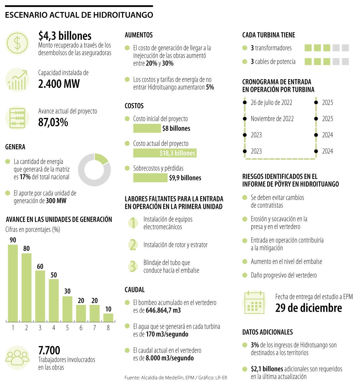 Frente a las recomendaciones en los frentes de obra realizados por Pöyry, EPM destacó que se ha avanzado en el taponamiento de los túneles que ocasionaron la emergencia en 2018, por lo que la otra semana el equipo de la consultora, junto con la Anla, realizarán una visita al proyecto para analizar estos aspectos, lo que puede incidir en el levantamiento de la medida restrictiva que, de no retirarse, significaría un obstáculo para el proyecto, ya que no podría entrar al operar en julio.