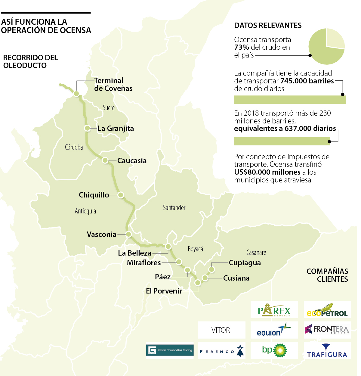 Estamos más o menos en los mismos niveles. En 2018 se transportaron en promedio 637.000 barriles por día y en este año vamos por encima ligeramente, con 639.500 barriles diarios en promedio. En total, Ocensa transporta 73% del crudo del país a través de su oleoducto, que cuenta con 10 estaciones entre Cupiagua y la terminal de Coveñas.